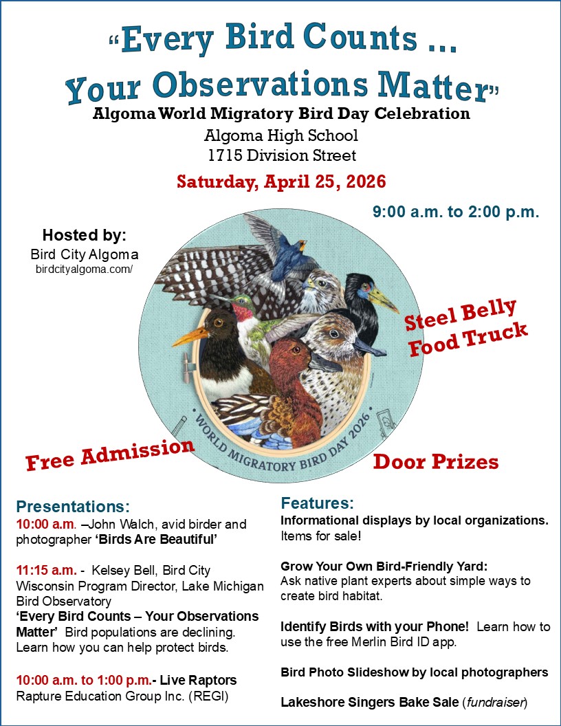 Algoma Celebrates Birds and Ways to Protect ThemThe annual Algoma World Migratory Bird Day Celebration, hosted by the Bird City Algoma Committee, will be held on Saturday, April 25, from 9:00 a.m. to 2:00 p.m. at Algoma High School, 1715 Division Street. This free, family-friendly event celebrates birds and ways we can help protect them. Presentations include photographer and avid birder John Walch at 10:00 a.m. presenting “Birds are Beautiful,” and Kelsey Bell, Bird City Wisconsin Program Director with the Lake Michigan Bird Observatory, at 11:15 a.m., speaking on this year’s theme, “Every Bird Counts – Your Observations Matter.” Additional highlights include live raptors from the Raptor Education Group Inc. (10:00 a.m.–1:00 p.m.), expert advice on native plants and creating a bird-friendly yard, and tips for identifying birds with your phone using the free Merlin Bird ID app. Enjoy informational displays, a bird photo slideshow, and door prizes. Food will be provided by a Lakeshore Singers bake sale and Steel Belly BBQ food truck. This celebration supports Algoma’s recognition as a Bird City Wisconsin Community, a designation that recognizes communities committed to bird conservation, habitat improvement, and public education. For more information, visit the Bird City Algoma Facebook page or website at birdcityalgoma.com, email birdcityalgoma@yahoo.com, or call 920-487-8136.